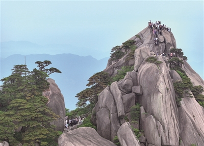 5月20日,游客在黄山风景区天都峰游览(无人机照片)。