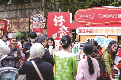 在非遗展示区,非遗技艺变身美味的“养生下午茶”,方回春堂非遗代表性传承人刘瑞龙表演“挂旗”绝技。另一边,师傅们邀请市民品尝养生下午茶:非遗技艺膏方冻、阿胶枣、阿胶奶茶、阿胶乌鸡汤……