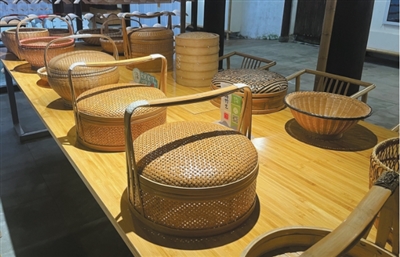彰坞村的竹艺馆是一处值得逛了再逛的乡村展览馆:过去,富春江两岸老百姓的日常生活器具、劳动生产工具都离不开篾匠活。篾制品种类也因此丰富异常,家常器物有花纹各异的篾席、女红篮、谷筛、米筛、糠筛、菜罩、扫帚、花篮、笠帽、排竹筒、鸡笼、鱼笼等。晾晒用具有篾垫、投箕、箩盖、烟帘子等;农具有插垫、篾箩、谷箩、谷筛、灰篮、篰篮、黄篾篮等;礼仪类用具有盘担、篾丝箱、小篾箩担、托盘、嫁女篮、响炮篮、长寿面篮等。因为很多篾器现在已经很难被准确称呼,所以展馆里的每件实物都写了名称,有的还专门设了文字介绍。