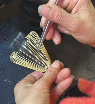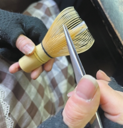 “真”这款茶筅,卷头这道工序和别的茶筅有所不同,筅丝的尾端并不卷拢,而是做成了空气刘海的样子,每根筅丝有微微的弧度,做好后成圆环形,握在手里,筅丝尾端薄如蝉翼,弹性极佳,手感非常好。这样的茶筅经茶艺师击拂,茶汤细腻,沫饽经久不散。