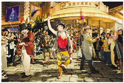 这是“古镇嘉年华”单元的一幕。今年这一单元汇聚了89个团队的117个节目,共有711名演员参与,涵盖巡游、舞蹈、戏剧等多种艺术形式,将街头、广场、桥边变为表演场地。观众不需要买票进剧场,便可成为街头戏剧的参与者。
