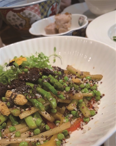 菜品方面,主打精致素食。黑松露炒饭是门店销量TOP1,由意大利进口橄榄油、黑松露酱与自然农法的三种米制作而成,米饭里还混着藜麦和野米,黑松露碎丰富。桂花酒酿圆子使用有机醪糟,无醇配方适合全家享用。此外,松露豆腐、素烧鹅、荔枝番茄等菜品也独具特色,以亲民的价格展现出素食界的米其林水准。