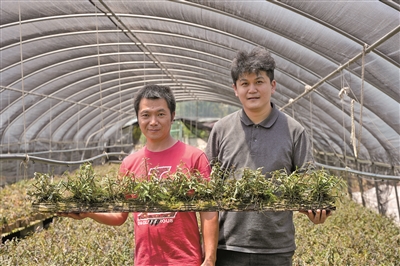 都市快报雁荡山铁皮石斛种植基地负责人吴近国(左) 都市快报健康生活探寻官李法君(右)