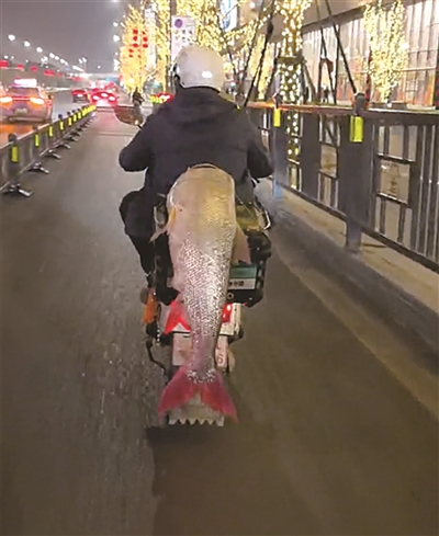 近日,江西南昌一男子钓到一条56斤的鳡(gǎn)鱼,骑着电动车绕城转,从晚上7:30转到次日凌晨0:30,逛了5小时才回家。