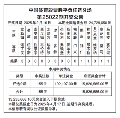 中国体育彩票胜平负任选9场 第25022期开奖公告