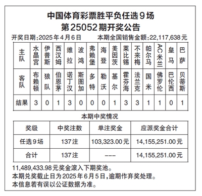 中国体育彩票胜平负任选9场 第25052期开奖公告