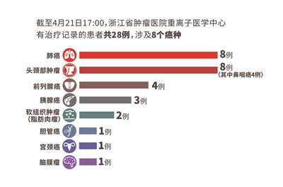 截至4月21日17:00,共有600多人次前来浙江省肿瘤医院重离子医学中心挂号重离子治疗门诊咨询,来问得最多的是胰腺癌患者。经过严格的重离子多学科会诊,已有100余位患者正在进行重离子治疗计划制定,有治疗记录的患者共28例(12位患者已经结束治疗),涉及8种癌症,分别为肺癌、头颈部肿瘤(包括鼻咽癌)、前列腺癌、胰腺癌、软组织肿瘤(脂肪肉瘤)、胆管癌、宫颈癌、脑膜瘤。