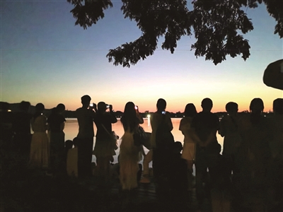 清晨4点,西湖“神舟基地”岸边已挤满等日出的人。 橙友“千帆过尽” 摄