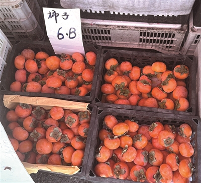 记者前天在凤起农贸市场及周边逛了逛,不少店铺和摊位都摆上了柿子、石榴等常见的秋季水果。所巷里几家并排的蔬果店,店门口的遮阳棚下摆了一筐筐五颜六色的水果,好多品种的桃子、西瓜占据显眼位置,3元/斤的蜜梨也家家都有,其中夹杂着几筐小柿子,宛若一个个橙红色的小灯笼,价格在6.8元/斤左右。