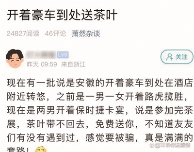 网友“江南小猪猪”:萧山钱江世纪城,一个人开着豪车,后排全是茶叶,说是单位款待客户剩下的,可以优惠出售,我愣了一下,心里想着难道是霸道总裁出来卖茶叶了,还好自己够穷……