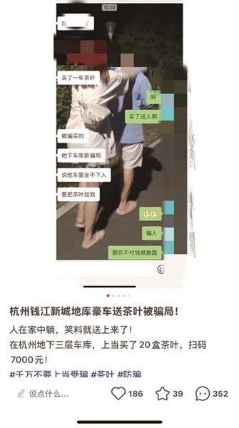 近日有网友发帖,在钱江新城地下三层车库,上当买了20盒茶叶,扫码7000元。“这事要是在新闻上看到,我都匪夷所思半天,咋这也能被骗!结果就发生在身边人的身上。刚开始还以为大哥开玩笑呢,没想到啊,阴沟里也能翻船!”网友还不忘提醒,大家小心别被骗了。