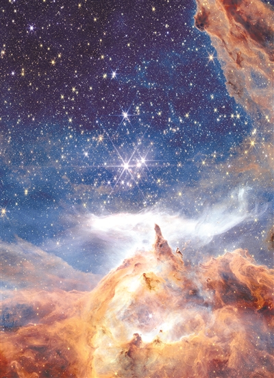 在这张近日发布的照片中,主角是名为Pismis-24的年轻星团,距离我们5500光年。这个星团被誉为大质量恒星的摇篮。炽热的新生恒星在这里密集聚集,它们发出的高能辐射与猛烈恒星风不断侵蚀周围的气体云,雕刻出奇形怪状的“天体山峦”。
