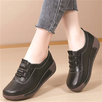 一脚蹬厚底坡跟鞋(2533)鞋面采用二层牛皮,柔软亲肤;值得一提的是,鞋子两侧包皮设计,从鞋头到鞋跟两侧,都是用真皮包边。 4.7厘米的厚底,从脚掌到脚跟自然过渡,不生硬,上脚也更稳当一些;鞋带是免系的,穿脱很方便。 有黑色、米色、豆沙三个颜色可选。