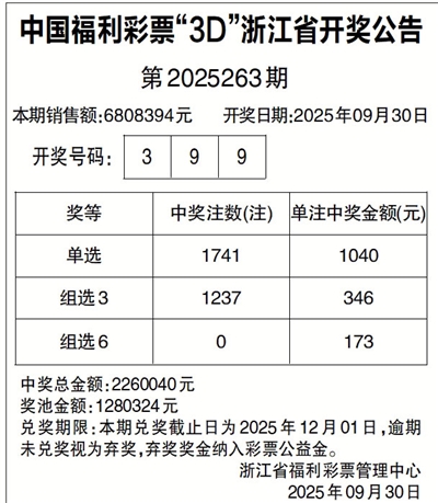 中国福利彩票“3D”浙江省开奖公告