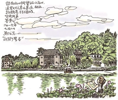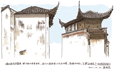 我把秋水山庄的门楼仍绘成从前的黄颜色,这是《申报》总经理史量才以他爱妻沈秋水命名而建的江南庭院式建筑。在北山街走一圈,有关历史人物也有好多:白居易、苏轼、林和靖、岳飞、林启、陈夔龙、秋瑾、孙中山、张静江、苏曼殊、孙传芳、刘锦藻、吴昌硕、黄宾虹、丰子恺、陈布雷、连横……