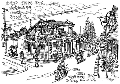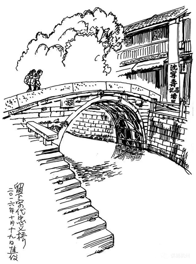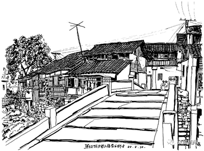 这次我在笕桥老街上从上午到傍晚共画了4幅速写。这条老街约200米长,可分为4段,中间有一座石桥。