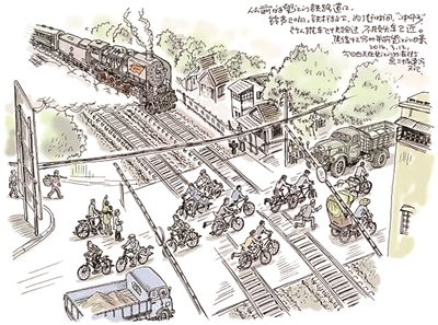 要说望江门最著名的风景就是铁路道口了。从前的道口,铃声一响,两根大铁杆就放下来,骑自行车的行人为了不等火车,就赶快冲啊!有时腿脚稍慢,铁杆就打在背上。逃出来的像是胜利者,好像赚了一票。后来也常发生大批行人堵在道口,而火车已经开过来,火车无奈被逼停。那时候的蒸汽机车从城站方向开过来的居多。在黑夜里,等待通行的人们看到一道光束从远处射来,划破夜空,真亮啊!