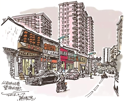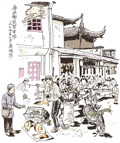 1992年的10月初,我心血来潮跑到屏风街口朝街里头画,忽然背后有一只手在拍我的肩:“请让一让好不好,我要做生意的!”原来是背后烤禽店的一个女营业员,一边对我喊话,一边用刷子在给鸭子刷上光的油。我只得往边上的肉摊挪动一下。