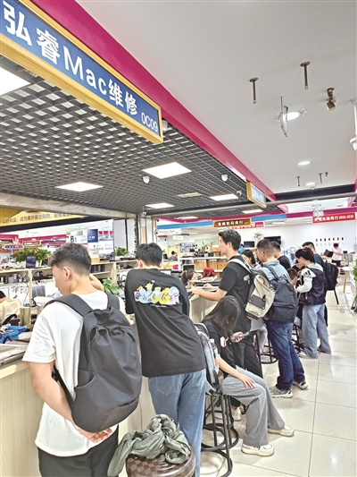 10月18日中午12:50,百脑汇科技大厦负一楼“弘睿Mac维修”柜台前十多位年轻人一字排开,他们都是来维修笔记本电脑的,其间有的修好离开,有的还在等待,不时又会有人加入。下午2:14,记者见到维修电脑的柜台前的年轻人都换了新面孔,排队的人更多了一些。