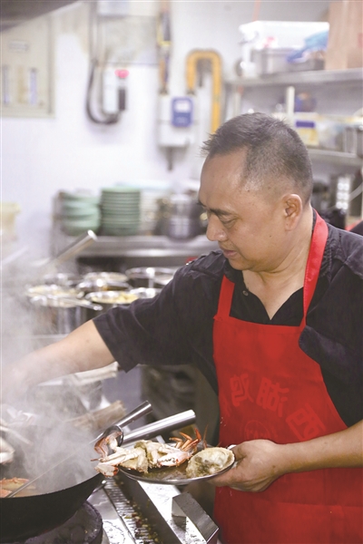 上世纪90年代,大川来到杭州做川菜,多年后看到老朋友,他一高兴就进厨房给我们做了几个菜,此时我注意到他的菜变“融合”了。川菜版的倒立蟹,是将梭子蟹对半切开后,倒立于铺满芝麻的香辣调料中,梭子蟹肉与芝麻结合,颊齿留香。还有哦,大川自己做的泡菜深埋在调料里,泡萝卜也沾上了蟹味。