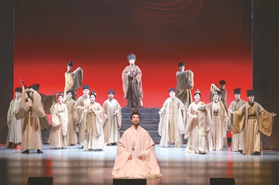 10月24日晚,新加坡滨海艺术中心剧院人头攒动。身着盛装的人们穿过夜幕步入剧场,大屏幕上滚动播放着音乐剧《南孔》主题曲《天下有礼》。随着演出的开始,舞台上《论语》中的经典语录映入观众的眼帘——学而时习之,不亦说乎?有朋自远方来,不亦乐乎?人不知而不愠,不亦君子乎?鲜明的中华文化符号,传递出“南孔有礼、浙江有礼、中国有礼、世界有礼”的人文气息。剧中人物次第登台:身负宗族荣耀又心怀家国,将天下文脉兴亡作为己任的孔洙;为了寻找圣人后裔,化身汉民,搜贤江南的元朝皇太子真金;琴棋书画样样精通的大家闺秀孔柳;始终坚定地站在孔洙身后的孔夫人;带领族人扈跸南渡,在剧中的关键节点与孔洙超时空对话的孔端友——他们共同为新加坡观众带来了《南孔》的理想世界。