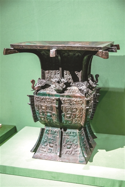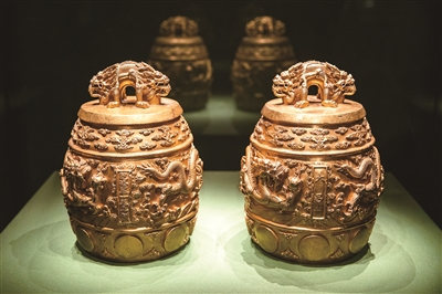三展厅为午门东雁翅楼展厅,以“万千气象”为主题,分列“文明赓续”“华章共谱”“太和充满”三个部分,展品有青铜莲鹤方壶、金瓯永固杯、青玉兽面纹璧等。下转B02版