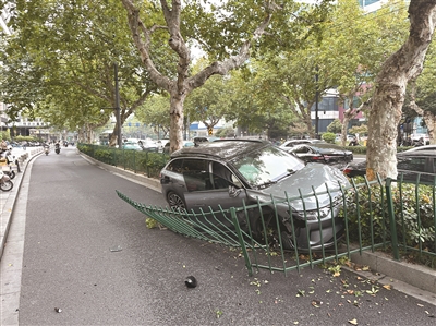 昨天15:52,有橙友爆料:体育场路君亭酒店边上,刚刚出了车祸,一辆灰色小轿车撞坏护栏冲进绿化带。