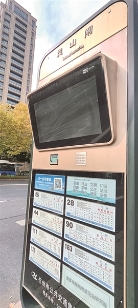这块黑屏的显示屏,位于环城东路自南向北方向的艮山闸公交站。橙柿直通车记者在现场看到,显示屏不工作后,暂时没办法查看实时公交信息。