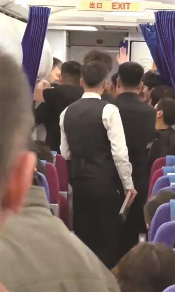 视频显示,机舱内乘客多已登机,但前舱门处有一女子与机组人员发生争执。
