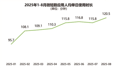 白皮书数据显示,2025年1-8月,微短剧应用的人均单日使用时长达到120.5分钟,较1月增幅达25.9%。