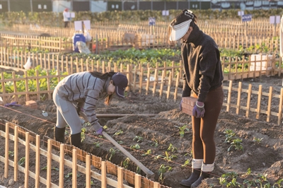 小罗和小刁正在刨地,这对小姐妹来自东北,住在菜园对面小区,两周前合租一块菜地,签了一年。她们在地里种了荷兰豆、豌豆、生菜、香菜、菠菜、花菜、芹菜、油麦菜、大头菜、莴苣,还准备留一小块地种草莓,又从花市买来很多花卉种子。