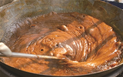 走进红糖厂,热气腾腾中,糖蜜度拉满。红糖厂的掌勺师傅,很多是老楼的“徒子徒孙”,拿着2米多长的大勺搅拌,如同炒菜般轻松。