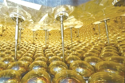 如果俯瞰,中微子的中心探测器好似一个超级大的西瓜,浸泡在44米深的水池当中,正睁大“眼睛”寻找中微子的踪迹。水池顶部,则是面积约1000平方米的宇宙射线径迹探测器。