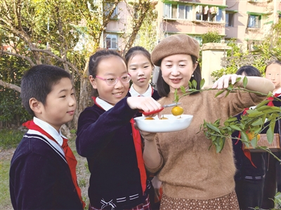 杭州市拱宸桥小学“毕业林”里,往届六年级毕业生栽种了几棵橘子树,今年果子成熟了,黄澄澄的橘子挂满枝头。