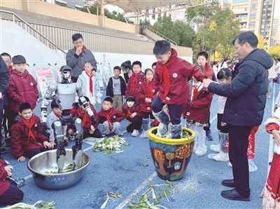 本次活动还请来了一位特殊嘉宾——来自宇树科技的机器人。只见机器人将脚缓缓跨进缸中,有节奏地抬起左右脚,一上一下,就像在腌菜缸中走路。同学们也都穿好鞋套,将脚跨进缸里“嘿哟嘿哟”地踩起来,一个比一个卖力,直到白菜表面明显渗出一层汁水。