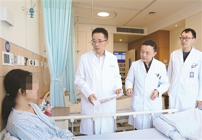 浙江大学医学院附属口腔医院院长祝颂松(右三)、口腔颌面外科学科主任李志勇(右二)正在查房(非本文患者) 医院供图