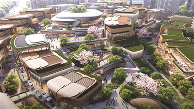 建成投用后,市民游客逛街时,沿着绿轴悠然“山行”,经历“银杏山径”“绿谷”和屋顶的“云端村落”八大空间,仿佛漫步于一座现代江南园林之中。在项目的东北角,将新建一座约150米高的地标性塔楼,这是整体项目的“门面担当”。