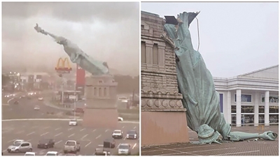 12月15日,巴西里约格兰德杜苏尔州的瓜伊巴市,一家Havan连锁百货商店门前的自由女神像复制品因强风(阵风超过90km/h)和暴风雨而倒塌。这座复制品是巴西Havan商店的标志性装饰,加上基座总高35米,于2020年安装。倒塌时雕像部分缓慢向前倾倒,落在停车场,但未造成人员伤亡或第三方财产损坏。基座保持完好,Havan公司已隔离现场并计划移除残骸。