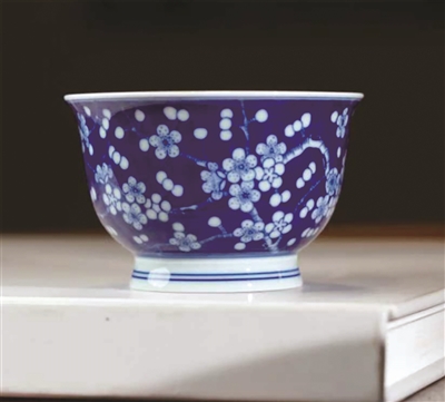 见山冰梅束腰杯。采用传统冰梅纹青花工艺,尽显“冰肌玉骨”的雅致瓷韵。