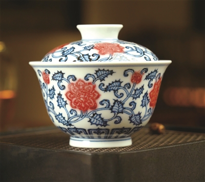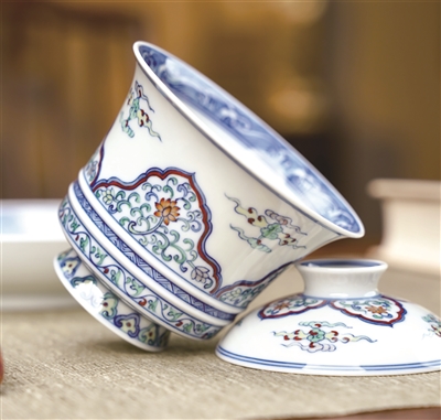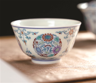 斗彩吉祥如意盖碗。以气窑精准控温的斗彩工艺打造,纹样鲜活饱满,尽显斗彩“彩釉交融”的精致质感。