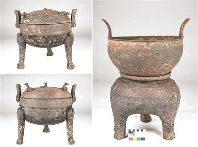 左上、左下:武王墩墓出土的铜鼎 右:武王墩墓出土的铜甗(yǎn)