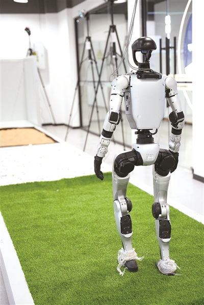 智能试验室,是机器人的“脑力和运动能力训练场”。训练室内,工作人员正在给人形机器人播放照片。