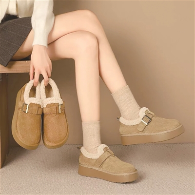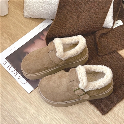 鞋面采用磨砂合成革,保暖透气,内里采用绒里,鞋底采用EVA。加绒加厚的材质,让脚不再冰凉,厚底(4cm)设计,特别显腿长,一脚蹬的设计,穿脱方便。