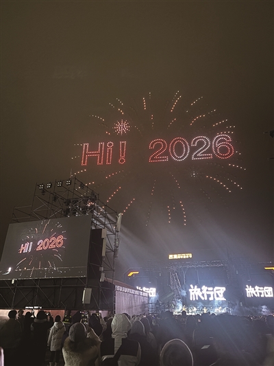 “5,4,3,2,1!新年快乐!”旅行团作为跨年表演嘉宾,陪伴现场超万名观众一起迎接新年。时针转向0点,时间进入2026,在现场浪潮般的欢呼声中,朋友相拥在一起,情侣互相亲吻,向对方表达爱意。