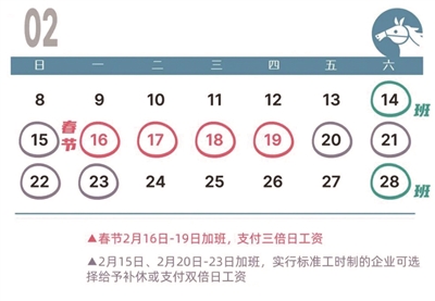 法定节假日为2月16日(除夕)至19日(正月初三),根据劳动法和《工资支付暂行规定》,用人单位安排劳动者在这些天加班的,应按照不低于劳动合同规定的劳动者本人日或小时工资标准的300%支付劳动者工资,且不能以补休替代。