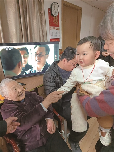 上午10点多,看到1岁曾孙屠宁煜来了,两位老人都要和他牵手,杨奶奶还伸出双手说抱抱,两位老人笑得非常开心。