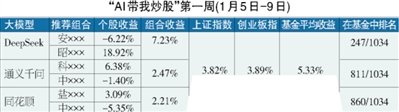 2026年首周(1月5日-9日),沪指16连阳站上4100点,再创10年新高,两市成交量历史上第5次突破3万亿元大关。最终,DeepSeek组合中的创新药股票(周收益18.92%)和科技创新股票(周收益-6.22%)取得了7.23%的收益,也就是说20万元本金跑出了14459元的账面收益,差不多是普通上班族约两个月的工资;通义千问组合(一只AI产业链龙头股6.38%,一只能源股-1.40%)以2.47%的周收益居第二;同花顺问财组合(一只消费股3.09%,一只AI算力股-5.35%)暂时垫底,周收益为2.21%。