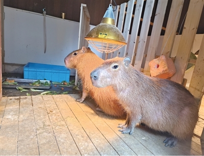 “卡皮巴拉已经开始发情了,饲养员看见过它们尝试在陆地上交配,但要成功完成交配,需要在水下进行,现在太冷了,它们不愿下水。卡皮巴拉体重到了就会发情,公的大概在80-100斤左右,母的要60斤以上。