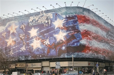 据美联社报道,伊朗上周末在首都德黑兰市中心竖起一幅巨幅宣传画。照片显示,宣传画中是一艘巨大航母,甲板上到处是士兵的尸体、血水和损毁的战机;蓝色甲板上有许多白色五角星图案,似为被炸后的破洞;甲板上的血流入海中,在航母后方形成三股红色尾迹。整个图案看似美国星条旗。宣传画上写着:煽风者将得到风暴。