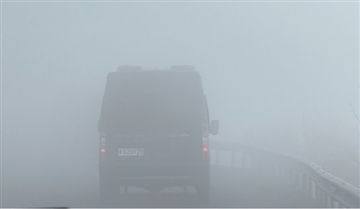 车子行驶中,雾气越来越重,前行的警车也被埋在雾里,会车时,前方车辆须离得很近才能看清。